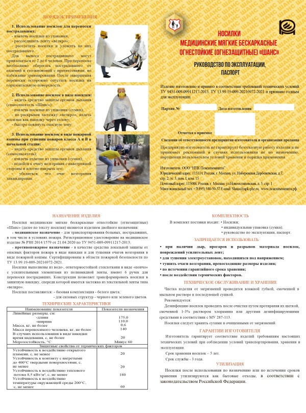 Медицинские носилки «Шанс» отлично сопротивляются воздействию огня, помогая переносить раненых и пострадавших людей из мест возгорания, неспособных к самостоятельному передвижению. Также они могут применяться, как огнезащитная накидка если существует риск контакта с открытым пламенем или сильно нагретыми предметами, в случае самостоятельного выхода из опасного района. Бескаркасные приспособления эффективны при необходимости локализации очага возгорания и способны играть роль противопожарной кошмы. Носилки рекомендуются к использованию в медицинских учреждениях и организациях соцзащиты как резервное средство транспортировки раненых, лишенных способности к самостоятельному перемещению.
